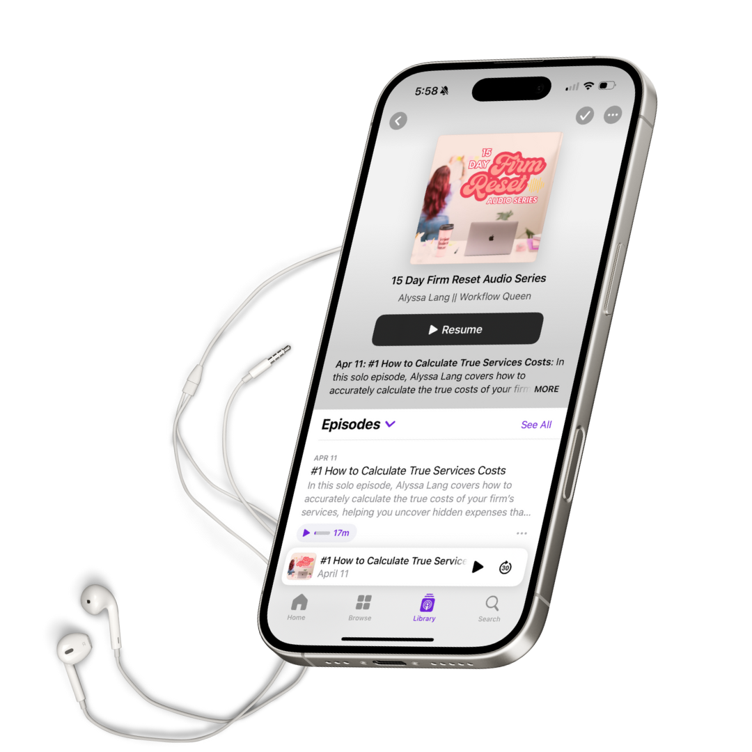 Get instant access to 15 bingeable, bite-sized audio episodes that show you exactly how to reclaim your time, raise your rates, and run a firm that doesn't run you.
